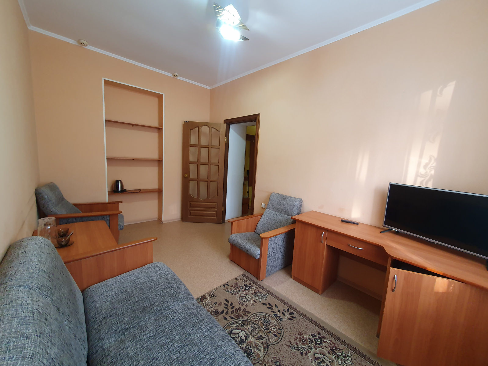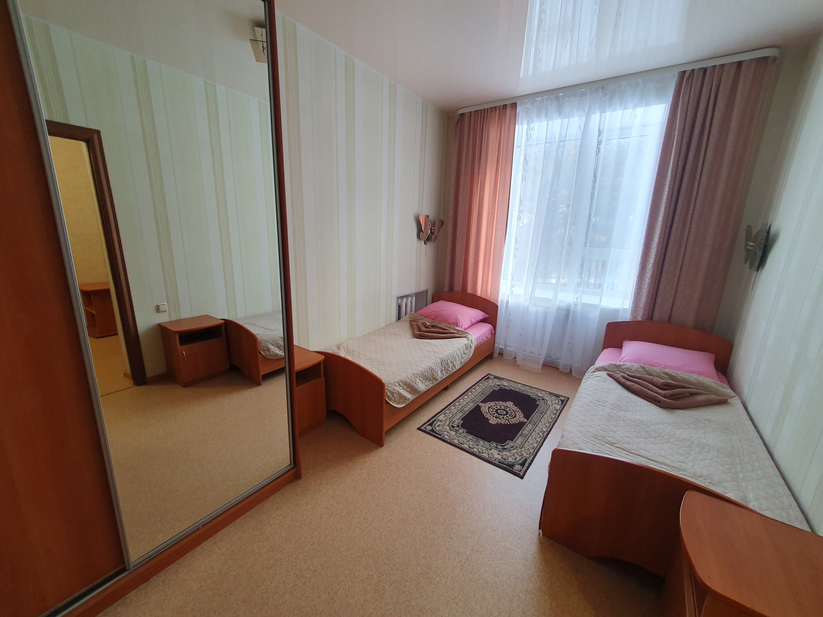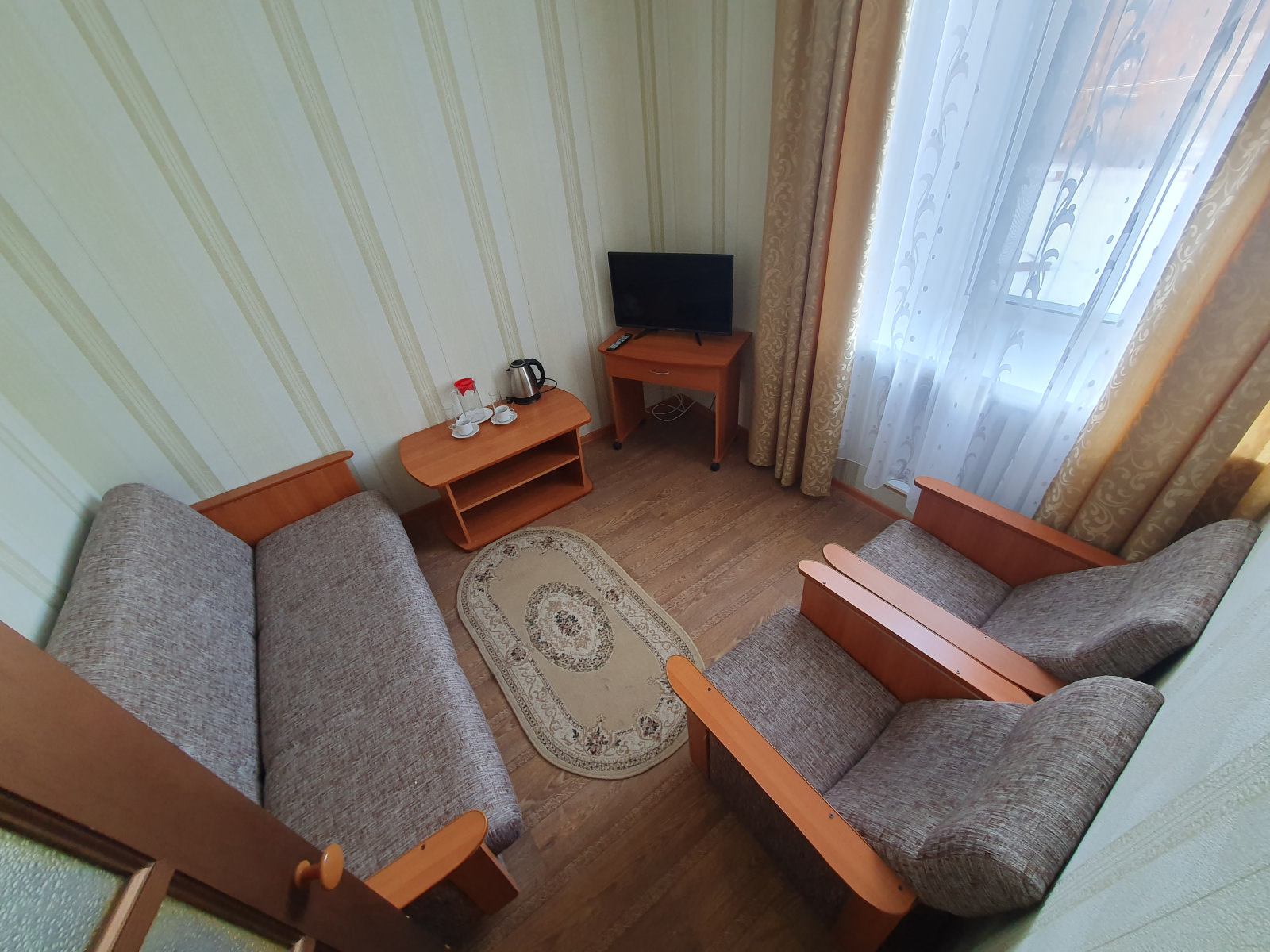 2 осн. места. 2 доп. места. Балкон. Мебель: вешалка, диван, зеркало, кресло (2), кровати односпальные, прикроватные тумбочки, столик журнальный, стул, шкаф. Оборудование: мини-холодильник, набор посуды, телевизор, электрочайник. Санузел. Сервис: смена полотенец, смена постельного белья, уборка номера.